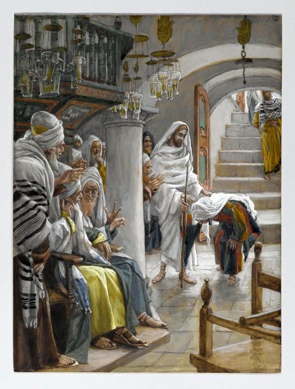 Explanation: In a synagogue, on the Sabbath, Jesus healed a woman who had been bowed down for 18 years and could not stand up straight. However, the ruler of the synagogue was indignant that Jesus had done work on the Sabbath. Jesus rebuked him and those who agreed with him for their hypocrisy, noting that they untied their animals on the Sabbath and led them away to be watered, but they wanted this daughter of Abraham, whom Satan had bound, to remain in bondage. The critics were put to shame, and the multitude rejoiced. To further emphasize God's power, Jesus told two parables: the Parable of the Mustard Seed (which grows from a seed to a tree), and the Parable of the Leaven Hidden in Three Measures of Meal (which leavens the whole lump). These parables emphasized the power of the Kingdom of God to dominate the earth. He had just demonstrated this truth by exerting Kingdom power over Satan's power which had dominated a woman for eighteen years.