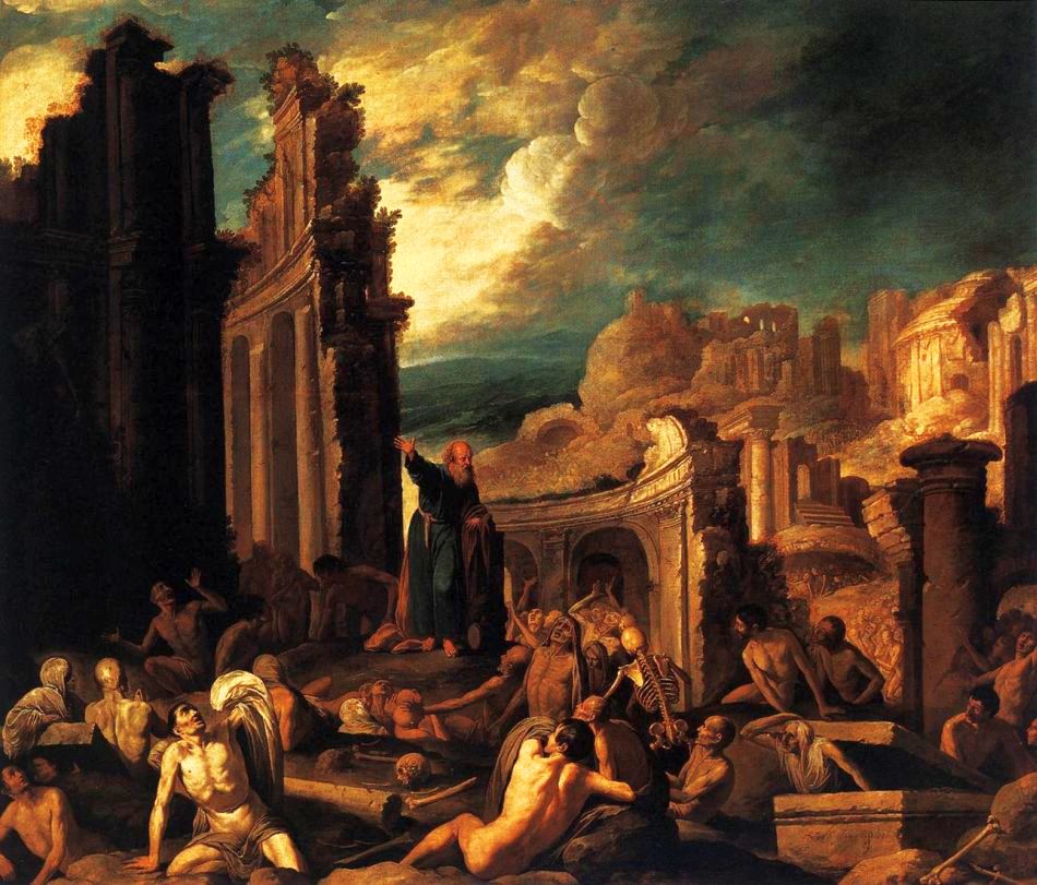 Today's painting depicts Ezekiel's vision of the resurrection of the dry bones.